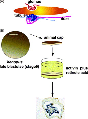 Pronephros formation in animal caps in Xenopus laevis. (A) Structure of pronephros. Pronephric tubule (purple) is connected to a nephric duct (pink). (B) Pronephros formation in animal caps treated with activin plus retinoic acid. Animal caps treated for 3 h contain pronephric tubules 3 days after the treatment.