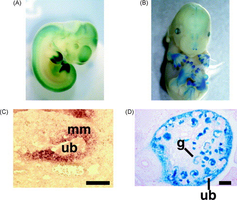 Sall1 expression. (A) Whole mount X-gal staining of Sall1-lacZ knockin mouse (11.5 dpc). Sall1 is expressed in limb buds, eye, the brain, and the spinal cord. (B) Whole mount X-gal staining of Sall1-lacZ knockin mouse (14.5 dpc). Note the Sall1 expression in fingers, eye, nose, and the anorectal region. (C) Sall1 expression in metanephric mesenchyme (11.5 dpc). (D) Sall1 expression in mesechyme and mesenchyme-derived structure (14.5 dpc). Abbreviations: mm, metanephric mesenchyme; ub, ureteric bud; g, glomerulus.