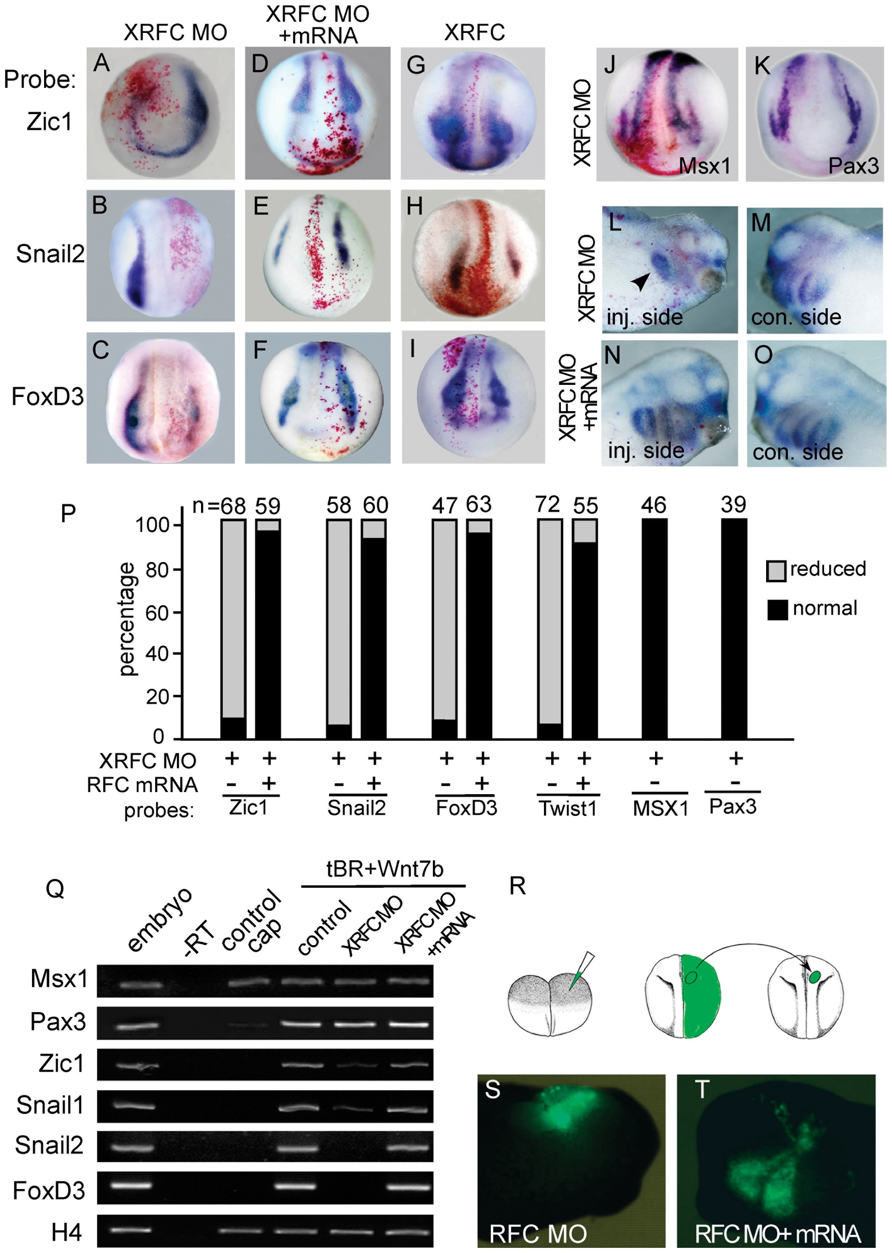 Figure S1. RFC is involved in the neural crest gene regulatory network. (A, B) The inhibition of Zic1 expression by dominant negative Msx1 can be rescued by XRFC. (C, D) Msx1 rescues the inhibition of Zic1 expression by XRFC-MO. (E) The inhibition of Snail2 expression by XRFC-MO can be rescued by Msx1, Pax3 and Zic1 co-expression. (I) The inhibition of FoxD3 expression by dominant negative Msx1, Pax3 and Zic1 can be rescued by co-injection of XRFC. (O, P) The inhibition effect on neural crest migration (as indicated by the distribution of the Twist1 positive neural crest cells) of Snail1-Znf can be rescued by co-injection of XRFC. The injected sides are indicated by the red staining of tracing lacZ. (Q) Quantification of the rescue effect of RFC on the expression of Zic1, FoxD3 or Twist1 inhibited by dominant negative Msx1, Pax3, Zic1 and Snail1 and the rescue of the XRFC-MO effect by Msx1, Pax3, and Zic1.
