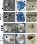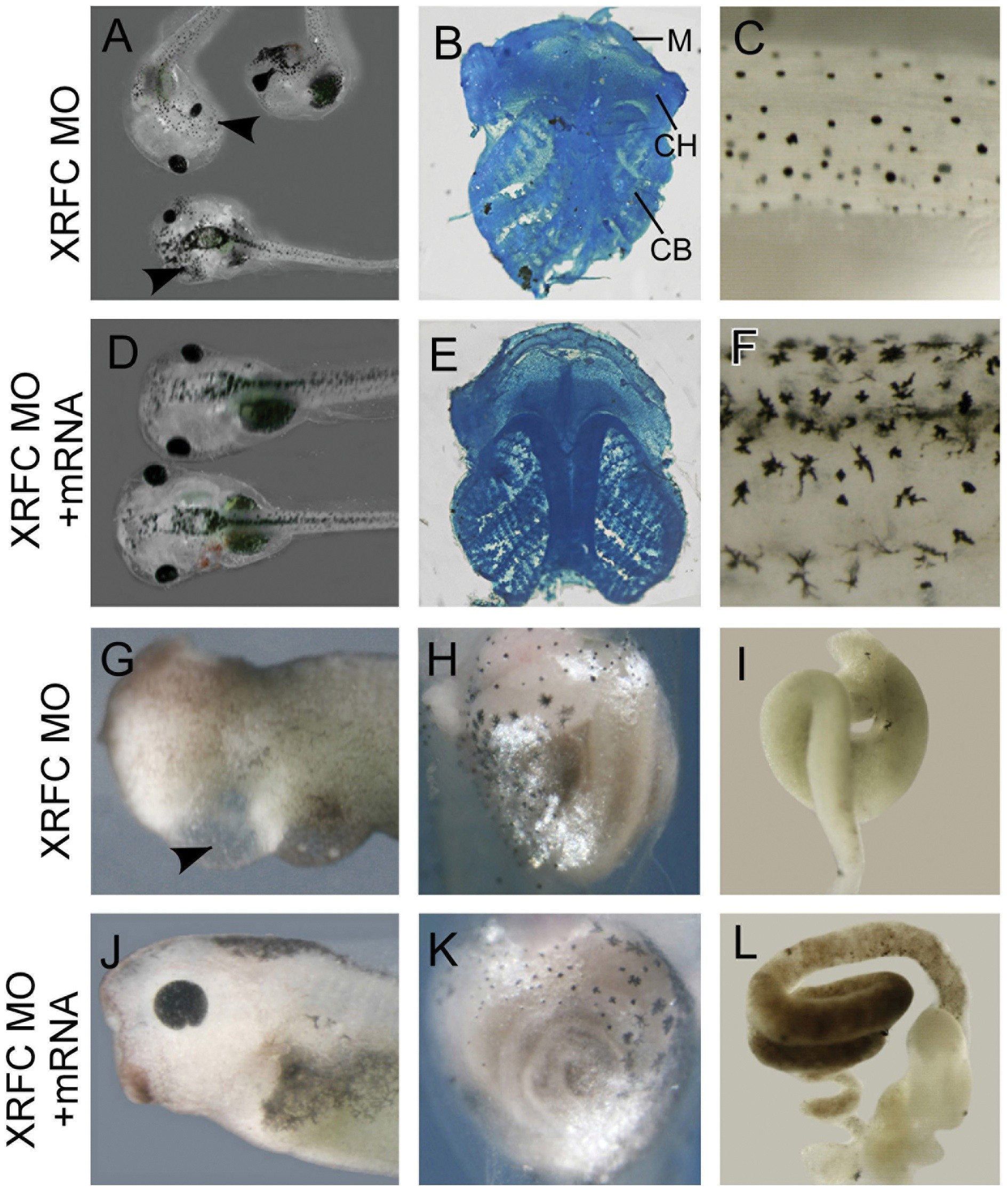 (A) Knockdown of XRFC caused craniofacial malformations (arrowheads) with curled trunks. (B) XRFC-MO inhibited the formation of cranial cartilage. Cartilages in late tadpoles were stained with alcian blue. Cartilage on the RFC-MO injected side was often malformed and reduced. M, meckel's cartilage; CH, ceratohyal cartilage; CB, ceratobranchial cartilage. (C) The XRFC-MO injected embryos were hypopigmented at tadpole stage. (G) The XRFC morphants showed enlarged pericardial cavity (arrowhead), indicative of heart defects. (H) The gut coiling in XRFC was malformed at tailbud (H) and tadpole (I) stages compared to the rescued group (K, L). (D, E, F, G, K, L) Co-injection of XRFC mRNA rescued the above mentioned malformations.