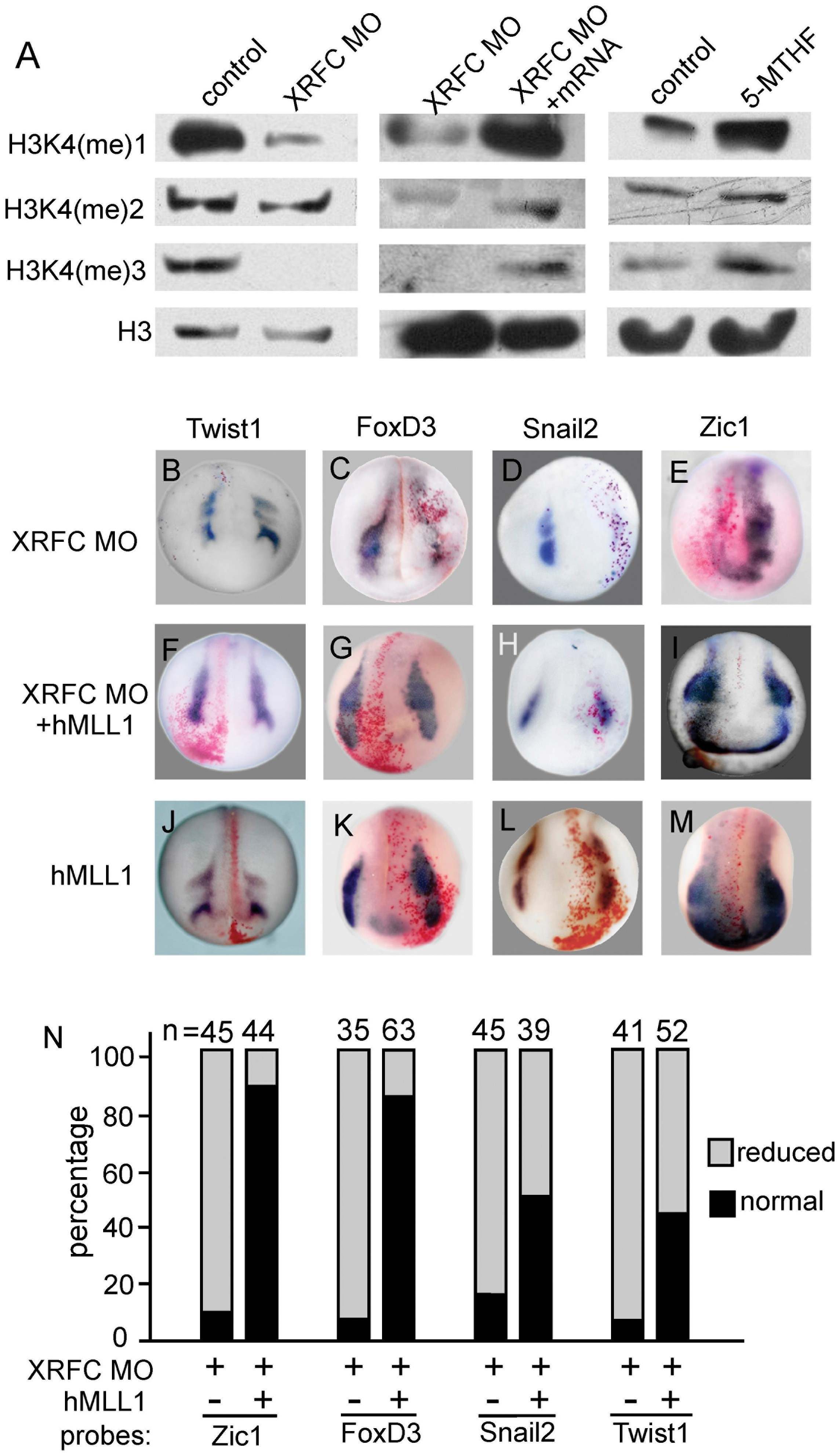 (A) Levels of different methylation forms of histone 3 in animal caps injected with XWnt7b and tBR with or without XRFC-MO. Knockdown of XRFC by injection XRFC-MO decreased both the mono- and trimethyl-H3-K4 levels but not dimethyl-H3-K4 level (left panel), which was restored by co-injection of XRFC mRNA (middle panel). Injection of 5-MTHF increased the mono- and trimethyl-H3-K4 levels but not dimethyl-H3-K4 level (right panel). (B) hMLL1 plasmid co-injection rescued the effect of XRFC-MO on the expression of Zic1 and FoxD3, and weakly on Snail2 and Twist1. (J-M) Overexpression of hMLL1 alone promoted the expression of Zic1 and FoxD3, but had no clear effects on Snail2 and Twist1. (N) Number of embryos showed reduced expression of Zic1, FoxD3, Snail2 and Twist1 injected with XRFC-MO with or without hMLL1 plasmid (50 pg/embryo).