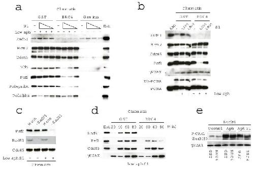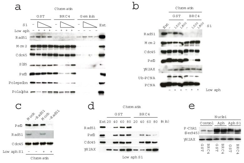Figure 2. RAD51 is required for stable chromatin association of fork proteins in the presence template breakage. In (a) fork proteins association to chromatin isolated from extracts treated with GST or GST-BRC4 and 0, 2.92, 0.97, and 0.32 U μlâ1 S1 nuclease in the presence of 1μg mlâ1 aphidicolin (Low aph) was analysed. In (b) we monitored the chromatin status of fork proteins, histone H2AX and PCNA in extracts treated with GST or GST-BRC4 2.92 (1/100) and 0.37 (1/800) U μlâ1 S1 nuclease and aphidicolin. In (c) chromatin binding of PSF2 and CDC45 in the presence of 0.97 U μlâ1 S1 nuclease was analysed in mock or RAD51 depleted extracts. In (d) chromatin binding of the indicated proteins over time in extracts treated with GST or GST-BRC4 and 1.46 U μlâ1 of S1 nuclease and aphidicolin was monitored. In (e) nuclear Chk1 phosphorylation on Ser 345 was monitored in extracts treated with 1μg/ml aphidicolin alone or in combination with 1.46 U μlâ1 of S1 nuclease. W.B in aâe were performed using antibodies against the indicated chromatin binding factors. Ext: 0.5 μl egg extract was loaded as control in (b) and (d). Chromatin and nuclear fractions were isolated 60 min after the addition of sperm DNA to egg extracts unless otherwise indicated.