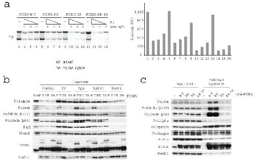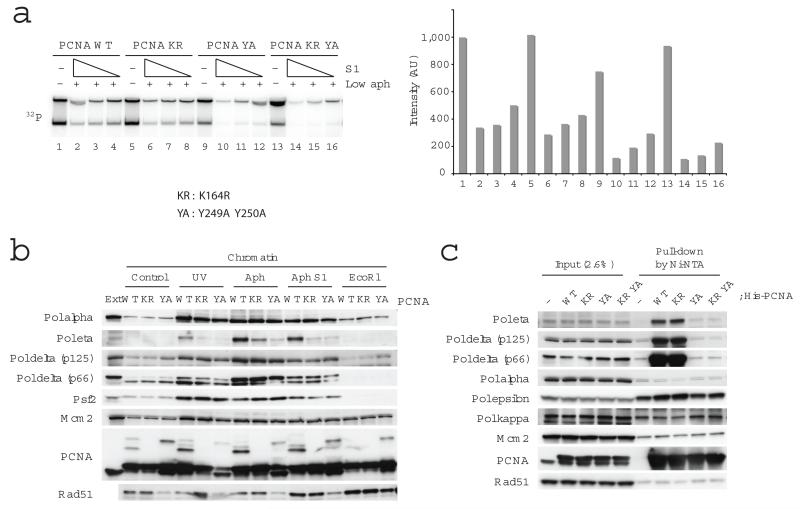 Figure 5. The role of PCNA in DNA replication and chromatin association of replication proteins upon fork collapse. In (a) replication of sperm nuclei incubated in extracts for 80 min in the presence of 1 μg ml−1 aphidicolin and 0, 0.73, 0.37, 0.18 U μl−1 S1 nuclease and PCNA wild type (WT), PCNA K164R (KR), PCNA Y249A Y250A (YA) or PCNA K164R Y249A Y250A (KR YA) recombinant proteins. Replication products were resolved by neutral agarose gel and subjected to autoradiography (left). Signal intensities were quantified and reported in the graph (right). (b) Binding to chromatin of the indicated proteins was monitored by immunoblotting of chromatin treated with 200 J m−2 UV or incubated in extracts treated with 1 μg ml−1 aphidicolin, 0.97 U μl−1 S1 nuclease or 0.1 U μl−1 EcoR1 and recombinant PCNA wild type (WT), PCNA K164R (KR) or PCNA Y249A Y250A (YA) as indicated. 0.5 μl egg extract was loaded as a control (Ext). (c) The interaction of PCNA and replication proteins in egg extract was monitored by incubation of His-tagged wild type and mutant PCNA proteins followed by pull down with Ni-NTA sepharose. The interacting proteins were detected by immunoblotting as indicated.