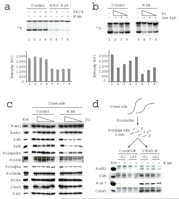 Figure 4. MRE11 nuclease activity is required for DNA replication upon fork collapse. In (a) and (b) the effects of MRE11 nuclease inhibitor mirin on replication of sperm nuclei that were untreated or treated with MMS in the presence or absence of GST-BRC4 (a) or on sperm nuclei incubated in extracts treated with 0, 0.73, 0.37, 0.18 U μl−1 S1 nuclease and aphidicolin were monitored (b). Replication products were monitored by 32P-dATP incorporation and resolved by neutral agarose gels, which were subjected to autoradiography. Signal intensities were reported in the graphs. In (c) the effect of mirin on replication proteins bound to chromatin isolated after 50 min incubation in extracts treated with 0, 1.46, 0.73, 0.37 and 0.18 U μl−1 S1 nuclease was analysed. In (d) the binding of the indicated fork proteins to chromatin incubated for 45 min in egg extracts that were untreated or supplemented with 0.73 U μl−1 S1 nuclease and mirin was monitored following protein crosslinking, sonication induced DNA fragmentation and immunoprecipitation with control and anti-CDC45 serum. * non-specific band. Ext: 0.5 μl egg extract was loaded as a control in (c) and (d).