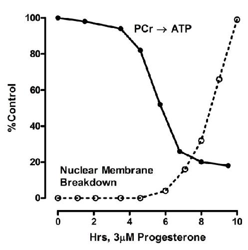 Progesterone triggers resumption of the first meiotic division in the Rana pipiens oocyte by binding to the N-terminal external loop of the catalytic subunit of Na/K-ATPase, releasing a cascade of lipid second messengers. This is followed by internalization of specific membrane proteins, plasma membrane depolarization and nuclear membrane breakdown, culminating in arrest at second metaphase. Progesterone initiates an increase in phosphoryl potential during the first meiotic division, resulting in the accumulation of high energy protein phosphate by second metaphase arrest. 31P-NMR, with saturation transfer, demonstrates that the phosphocreatine level rises ~2 fold and that the "pseudo" first order rate constant for the creatine kinase reaction falls to ~20% of the control by the onset of nuclear membrane breakdown. 32PO4 pulse-labeling reveals a net increase in phosphorylation of yolk protein phosvitin during this period. The increased yolk protein phosphorylation coincides with internalization of membrane Na/K-ATPase and membrane depolarizatio These results indicate that progesterone binding to the catalytic subunit of the Na-pump diverts ATP from cation regulation at the plasma membrane to storage of high energy phosphate in yolk protein. Phosvitin serves as a major energy source during fertilization and early cleavage stages and is also a storage site for cations (e.g. Na+, K+, Ca2+, Fe2+/3+) essential for embryonic development.