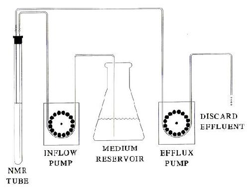Figure 8. Diagram of the apparatus used to superfuse 200-250 isolated Rana pipiens follicles loosely packed in a 10 mm diameter NMR tube containing modified Ringer's solution. Measurements were made at 20-22°C in Ringers solution with or without progesterone. Using two peristaltic pumps, follicles were continuously superfused by introducing aerated Ringer's solution at the bottom of the NMR tube (1 ml/min) and drawing medium off at the top of the tube. As shown, effluent was discarded and not recycled.