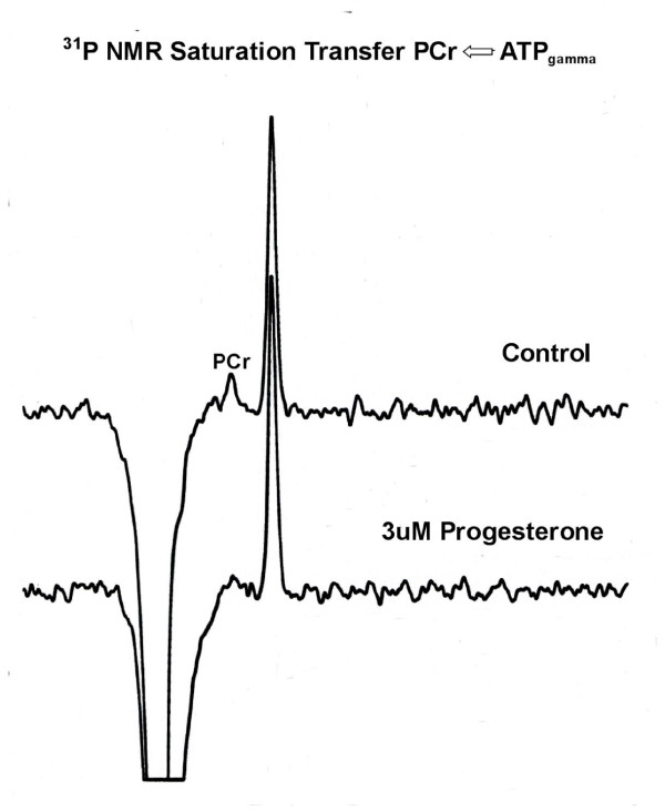 Figure 4. A comparison of the saturation transfer difference spectra of follicles superfused with Ringer's solution (control, upper spectrum) and Ringer's solution containing inducing levels (3.2 UM) of progesterone (lower spectrum) at 20-22°C. The midpoint of the spectral data aquisition corresponded to a 5.5 h exposure to progesterone. A marked decrease in the γP → PCr saturation transfer effect is observed in progesterone-treated oocytes. Again, the large inverted peaks are due to incomplete cancellation of the overwhelming phosvitin signal.