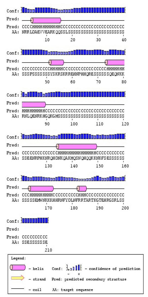 Figure 7. Predicted structure of the frog phosvitin component of Vitellogenin-A2 (1807 amino acids; Accession #P18709). The Protein Structure Prediction Server (PSIPRED) [16] was used to examine the possible conformation of the serine-rich phosvitin sequence (ca. 1126 - 1321). Line 1 indicates the confidence of the prediction, line 2 the relative position of each helix, line 3 whether the residue is part of a helix, strand or coil (see legend), and line 4 indicates the amino acid. Going from N- to C-terminal end, the sequence contains blocks of 38, 8, 28, 13 and 13 serine residues.