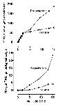 Figure 6. Comparison of 32PO4 uptake by control and progesterone-treated Rana pipiens ovarian follicles. Upper panel: in-vitro [32PO4] uptake by control and progesterone-treated denuded oocytes. Oocytes were incubated in Ringers' solution containing 0.08 mM NaHPO4 and 32PO4 uptake is expressed as μmols/1 cell water. Lower panel: oocytes from the upper panel were homogenized in 7% TCA and protein isolated as described in Methods. 32PO4 uptake into total protein is expressed as μmols/kg wet weight.