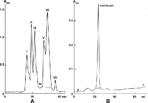 A, separation of crude A. feae venom by gel filtration on Superdex HR75 column (10 × 300 mm) in 0.1 m ammonium acetate buffer, pH 6.2, at a flow rate of 30 ml/h. B, isolation of azemiopsin by reverse-phase HPLC on a Jupiter C18 (4.6 × 250 mm) column in a linear gradient of acetonitrile in water (0.1% TFA). Flow rate is 1 ml/min.
