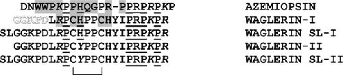 FIGURE 2. Comparison of the amino acid sequences of azemiopsin and waglerins. Identical residues are underlined, conservative substitutions are italicized. The residues essential for biological activity are indicated by gray hatching. The first 5 N-terminal residues in waglerin, the removal of which results in loss of activity (LD50 > 10 μg/g), are shown in outline.