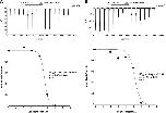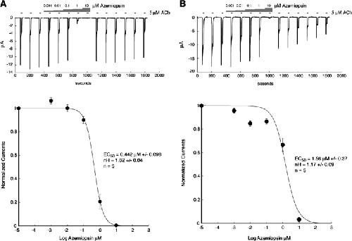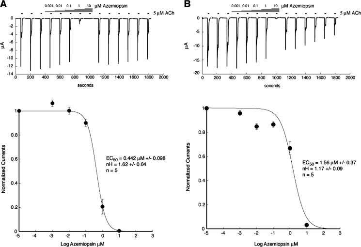 FIGURE 4. Inhibition by azemiopsin of human muscle-type nAChRs expressed in Xenopus oocytes. To evaluate effects of the toxin, cells were challenged at regular intervals (2 min) with brief ACh test pulses (5 μm, 5 s). Following a stabilization period, toxin was applied at different concentrations for at least 1 min. The response to ACh (5 μm) was tested again, and recovery from inhibition was monitored over several minutes. Results obtained with adult α1β1ϵδ nAChR are illustrated in A whereas effects on fetal α1β1γδ form are shown in B. Plot of the peak current as a function of the logarithm of the azemiopsin concentration yielded typical inhibition curves that were fitted with a single Hill equation (continuous curves). Values for the best fit are indicated on the figure.