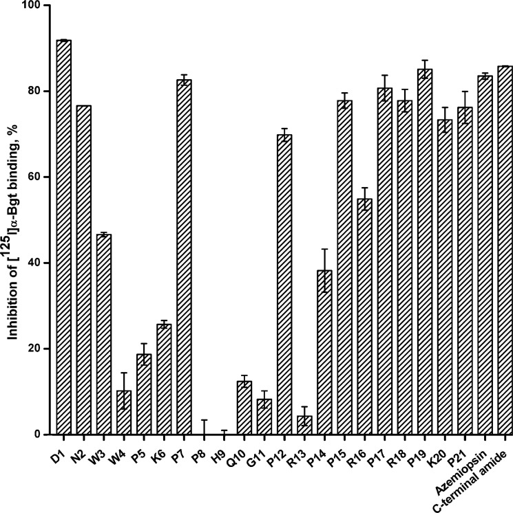 Abscissa indicates azemiopsin amino acid residues replaced by alanine. The binding of 125I-labeled α-bungarotoxin (Bgt) was determined after incubation of Torpedo membranes with 2 μm analogue for 1 h. 125I-Labeled α-bungarotoxin binding in the absence of peptide was taken as control (no inhibition).
