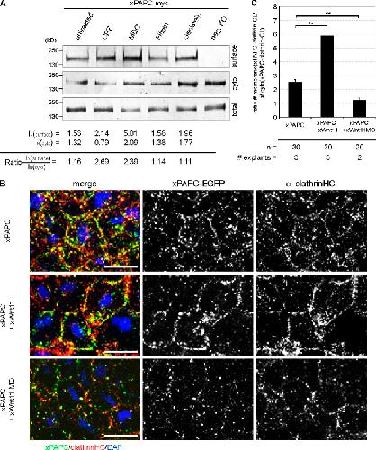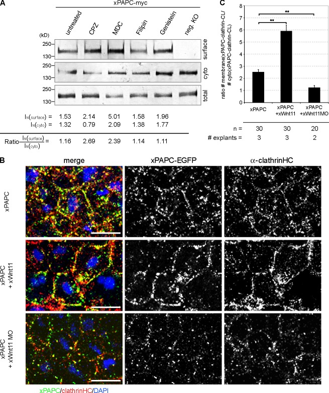 Figure 4. Wnt-11 controls PAPC membrane localization by blocking its clathrin-mediated internalization. (A) Cell surface biotinylation assay performed with DMZ explants, injected with 1 ng xPAPC-myc RNA, and treated with clathrin- and caveolin1-specific inhibitors. Cell surface, cytoplasmic (cyto), and total protein amounts of xPAPC-myc were detected by Western blotting using specific myc tag antibody (9E10). The relative xPAPC-myc signal intensity (IN) of cell surface and cytoplasmic fractions were measured as described in Materials and methods. Finally, the ratio surface versus cytoplasmic fraction was calculated. The cell surface amount of xPAPC increased in the presence of clathrin-specific inhibitors. Used clathrin-specific inhibitors were 60 µM chlorpromazine (CPZ) and 300 µM monodansylcadaverine (MDC). Used caveolin1-specific inhibitors were 5 µg/ml filipin and 200 µM genistein. neg. KO, negative control. (B) Confocal microscopic analysis of DMZ explants, cryosectioned, and immunostained for clathrinHC and xPAPC-EGFP. Nuclei were stained with DAPI. xWnt-11 expression resulted in clathrin-xPAPC accumulation at cell membranes. In xWnt-11 morphants, membrane localization of clathrin and PAPC was strongly reduced but increased in intracellular vesicles. Injection amount was as follows: 500 pg xPAPC-EGFP RNA, 20 pg xWnt-11 RNA, and 1 pmol xWnt-11 MO. Bars, 20 µm. (C) Ratio number of membrane versus cytoplasmic colocalization of xPAPC (xPAPC-clathrin-CL) and clathrinHC in dependency of xWnt-11 (for more details, see Materials and methods). Error bars show SEM. Studentâs t test was performed (**, P < 0.005). n, number of cells. |