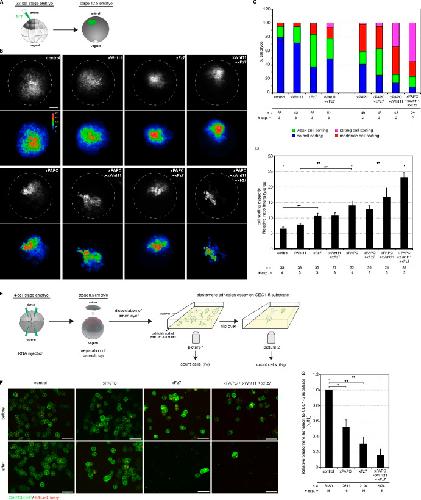 Figure 5. Wnt-11/Fz7 and PAPC cooperate in decreasing C-cadherin–mediated cell adhesion. (A) Scheme of cell dispersal assay. One animal blastomere of a 32-cell–stage embryo was injected with synthetic mRNAs together with the lineage tracer GAP43-GFP. At stage 12.5, intermingling of GFP-expressing cells was monitored. The patch morphology reflects changes in cell sorting activity as a result of changes in cell adhesion: tight patches with sharp borders and high fluorescence intensity indicate strong cell sorting properties. (B) Cell dispersal assay. Representative images of stage-12.5 embryos. Dashed lines reflect embryo size. Bar, 900 µm. Corresponding pseudocolor images show fluorescence intensity. Relative intensity of fluorescence is indicated by the color bar, where blue and violet represent the lowest and the highest level of detectable fluorescence, respectively. (C) Evaluation of the increasing changes in cell sorting activity. n, number of embryos; # exp., number of experiments. (D) Quantitative evaluation of cell dispersal assay. The diagram displays the cell sorting activity expressed as the relative ratio between intensity and area (for more details, see Fig. S3 and Materials and methods). Error bars indicate SEM. Student’s t test was performed (**, P < 0.005). (E) Scheme of blastomere adhesion assay. Synthetic mRNAs were injected in the animal hemisphere of 4-cell–stage embryos together with the lineage tracers GAP43-GFP and H2B-mCherry. At stage 8.5, animal caps were dissected. The blastomeres of the inner layer were dissociated, spotted on 1 µg/ml CEC1-5–coated substrates, and allowed to adhere. The adhesion strength of blastomeres was measured by the ratio of the number of blastomeres remaining attached after (Nt) versus the number before (N0) flipover of the Petri dish. (F) Representative images of dissociated blastomeres expressing the indicated constructs attached to the CEC1-5 substrate before and after the flipover. Bars, 100 µm. (G) Quantification of the blastomere adhesion assay. The diagram displays the xC-cadherin adhesion index as the relative ratio between blastomeres attached to the CEC1-5 substrate after and before flipover. Injection amount was as follows: 500 pg xPAPC RNA, 500 pg xFz7 RNA, 20 pg xWnt-11 RNA, 100 pg GAP43-GFP RNA, and 250 pg H2B-mCherry RNA. Error bars indicate SEM. Student’s t test was performed (*, P < 0.05; **, P < 0.005). n, number of counted blastomeres. |