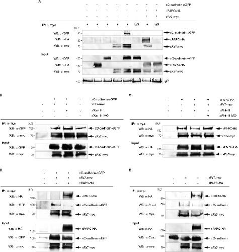 Figure 6. Fz7 complex formation with C-cadherin and PAPC shown by coimmunoprecipitations. For coimmunoprecipitation (co-IP) assays, the indicated constructs were injected into the DMZ of 8-cell–stage embryos. At stage 10.5, DMZ explants were dissected and lysed. In all cases, xFz7 was precipitated with myc antibody (9E10), and complex formation was detected by Western blotting (WB) for the proteins shown (arrows). (A) xPAPC and xC-cadherin coimmunoprecipitations with xFz7. xFz7 interacted with both xC-cadherin and xPAPC. (B and C) xWnt-11–dependent coimmunoprecipitations of xFz7 with xC-cadherin (B) or xPAPC (C). No significant changes could be detected. (D and E) xC-cadherin coimmunoprecipitations with xFz7 in the presence of xPAPC. xPAPC competed with both exogenous (D) and endogenous (E) xC-cadherin for xFz7 complex formation with preference for xPAPC/xFz7 complex. Injection amount was as follows: 1 ng xC-cadherin–EGFP RNA, 1 ng xPAPC-HA RNA, 500 pg xFz7-myc RNA, 40 pg xWnt-11 RNA, and 1 pmol xWnt-11 MO. |