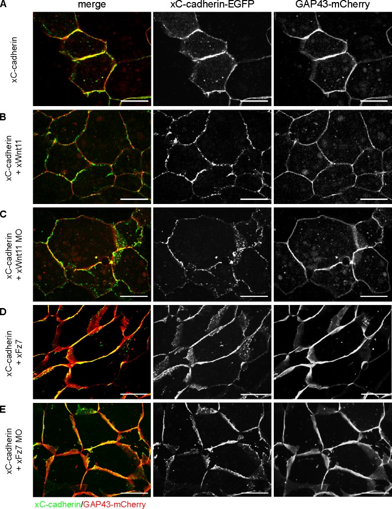 Figure 2. C-cadherin surface expression is not affected by Wnt-11 and Fz7. Time-lapse microscopic analysis of xC-cadherin subcellular localization during convergent extension. 16-cell–stage embryos were injected into the DMZ region with 500 pg xC-cadherin–EGPF RNA alone or in combination with 20 pg xWnt-11 RNA, 1 pmol xWnt-11 MO, 500 pg xFz7 RNA, or 1.6 pmol xFz7 MO. 200 pg GAP43-mCherry RNA was coinjected in all samples as a cell membrane tracer. At stage 10.25, DMZ explants were cut, and subcellular localization of xC-cadherin–EGFP was analyzed. (A–E) Representative images of confocal time-lapse videos are shown. Neither overexpression nor depletion of xWnt-11 or xFz7 had an effect on xC-cadherin–EGFP subcellular localization. Bars, 20 µm. |