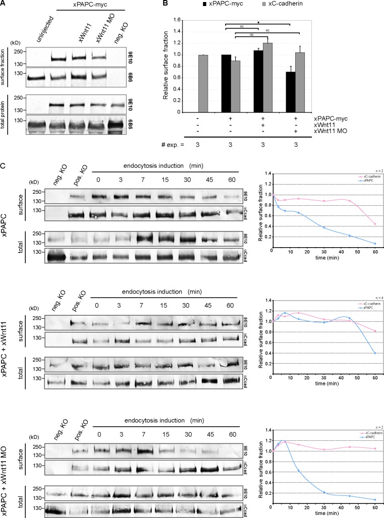 Figure 3. Wnt-11 stabilized cell surface PAPC, whereas C-cadherin remained unaffected. (A) Cell surface biotinylation assay performed with DMZ explants. Cell surface and total protein amount of xPAPC-myc (9E10) and endogenous xC-cadherin (6B6) were detected by Western blotting. xWnt-11 depletion reduced cell surface amount of xPAPC-myc, whereas cell surface level of endogenous xC-cadherin was not effected. neg. KO, negative control. (B) Relative cell surface amounts of xPAPC-myc and endogenous xC-cadherin in dependency of xWnt-11, calculated as described in Materials and methods. Error bars show SEM. Student’s t test was performed (*, P < 0.05). # exp., number of independent experiments. (C) Biotin pulse-chase experiment performed with DMZ explants. At the indicated induction times, the residual biotin-labeled (surface) and total protein amount of xPAPC-myc (9E10) and endogenous xC-cadherin (α-Ccad) were detected by Western blotting. Relative surface amounts of xPAPC-myc and endogenous xC-cadherin were plotted over endocytosis induction time. Cell surface xPAPC was stabilized in xWnt-11–overexpressing DMZ explants, whereas xWnt-11 depletion led to a faster degradation of xPAPC membrane fraction. xWnt-11 did not affect the cell surface expression of xC-cadherin. Injection amount was as follows: 1 ng xPAPC-myc RNA, 40 pg xWnt-11 RNA, and 1 pmol xWnt-11 MO. pos. KO, positive control. n, number of independent experiments. |