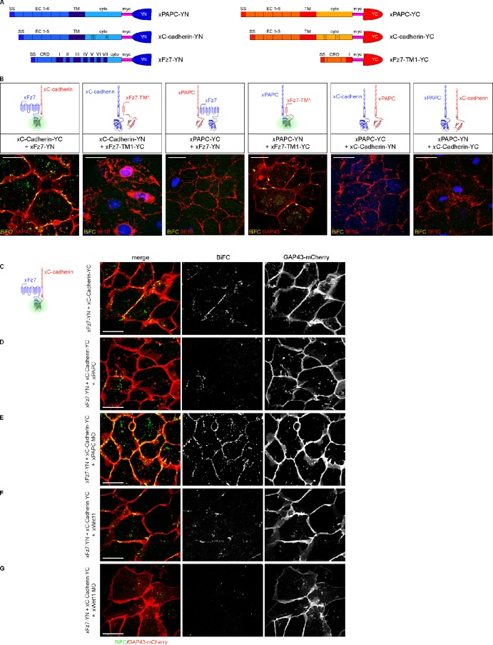 Figure 7. Fz7 interacts with C-cadherin and PAPC at the cell membrane in vivo, shown by BiFC. (A) Primary structure of the different split YFP constructs used in the BiFC assay. The putative interacting partners were either fused to YFP fragment consisting of the first N-terminal 155 amino acids (YN) or the last C-terminal 83 amino acids (YC) of YFP. All constructs contained a myc tag that served as a control for successful expression. β, β-catenin binding site; CRD, cysteine-rich domain; cyto, cytoplasmic region; EC, extracellular cadherin repeat; p120, p120 binding site; SS, signal peptide sequence; TM, transmembrane domain. (B) Expression of different combinations of the split YFP constructs in DMZ explants to monitor complex formation in vivo during convergent extension. DMZ explants were either coinjected with GAP43-mCherry (GAP43) to label cell membranes or fixed and fluorescently immunostained for split YFP constructs using myc antibody (9E10) to control their successful expression. Nuclei were stained with DAPI. Proteinâprotein interaction was displayed by the YFP fluorescence (BiFC). Full-length xFz7 interacted with xC-cadherin, whereas xFz7-TM1 interacted with xPAPC at the cell membranes. No direct interaction between xC-cadherin and xPAPC was observed. (CâG) In vivo xFz7âxC-cadherin complex formation in the presence or absence of xPAPC or xWnt-11. Cell membranes were labeled with GAP43-mCherry, and proteinâprotein interaction was displayed by YFP fluorescence (BiFC). Depletion of xPAPC promoted the interaction between xFz7 and xC-cadherin, whereas in Wnt11 morphants, xFz7âxC-cadherin complex formation was abolished. Injection amount was as follows: 1 ng xPAPC-YN/YC RNA, 1 ng xC-cadherin-YC/YN RNA, 500 pg xFz7-YN RNA, 500 pg xFz7-TM1-YC, 20 pg xWnt-11 RNA, 1 pmol xWnt-11 MO, 1 ng xPAPC RNA, 1.6 pmol xPAPC MO, and 200 pg GAP43-mCherry RNA. Bars, 20 µm. |
