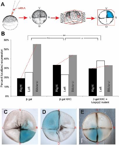 Fig. 3. Tubulin mutations affect early microtubule-dependent motor protein transport. (A) Embryos were injected into the very top of the animal pole shortly after fertilization with either a control β-gal mRNA, mRNA encoding the β-gal:KHC motor protein fusion construct or a mixture of β-gal:KHC and mutated tubgc2. At the four-cell stage, embryos were fixed and processed for β-gal staining then embedded with consistent LR orientation, sectioned and scored for localization of the blue stain in the blastomeres as described (19). (B) Control embryos, injected with β-gal mRNA, displayed little LR bias (19% right, 25% left, 56% bilateral), whereas embryos that had been injected with β-gal:KHC displayed a significant rightward bias in β-gal localization (33% right, 23% left, 44% bilateral). Coinjections of tubgcp2 with the β-gal:KHC reversed this rightward bias (30% right, 38% left, 33% bilateral). *P < 0.05, **P < 0.01, Ï2 test. (CâE) Typical β-gal expression patterns observed in sectioned four-cell embryos.