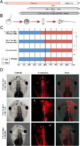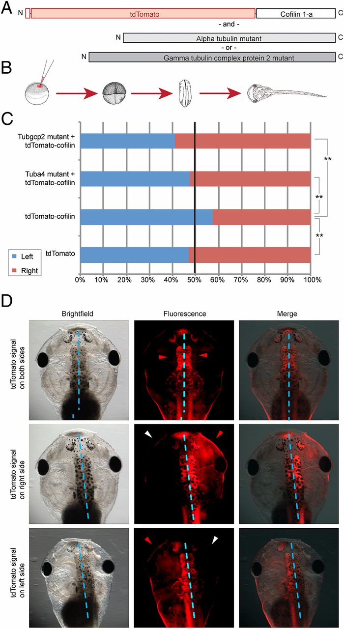 Fig. 4. Tubulin mutations alter biased Cofilin-1 expression. (A) tdTomato:Cofilin-1a fusion mRNA was injected into Xenopus embryos either alongside tub4a mutant mRNA, tubgcp2 mutant mRNA or on its own. (B) Injections were made shortly after fertilization; embryos were reared to stage 45 before scoring for tdTomato fluorescent signal. (C) Control embryos, injected with solely the tdTomato fluorescent marker displayed virtually no bias for signal localization (left localized:right localized ratio, L:R = 0.89, n = 117), whereas tdTomato:Cofilin-1a injected embryos displayed a leftward bias (L:R ratio = 1.35, n = 192). Embryos that had been coinjected with the tdTomato:Cofilin-1a and a tubulin mutant (either tub4a or tubgcp2) resulted in reversals in this bias (0.91 L:R ratio in tub4a mutant, n = 127; L:R ratio = 0.69 in tubscp2 mutant, n = 208). Blue dashed line indicates embryo midplane. (D) tdTomato expression patterns observed in stage 45 Xenopus embryos. *P < 0.05; **P < 0.01.