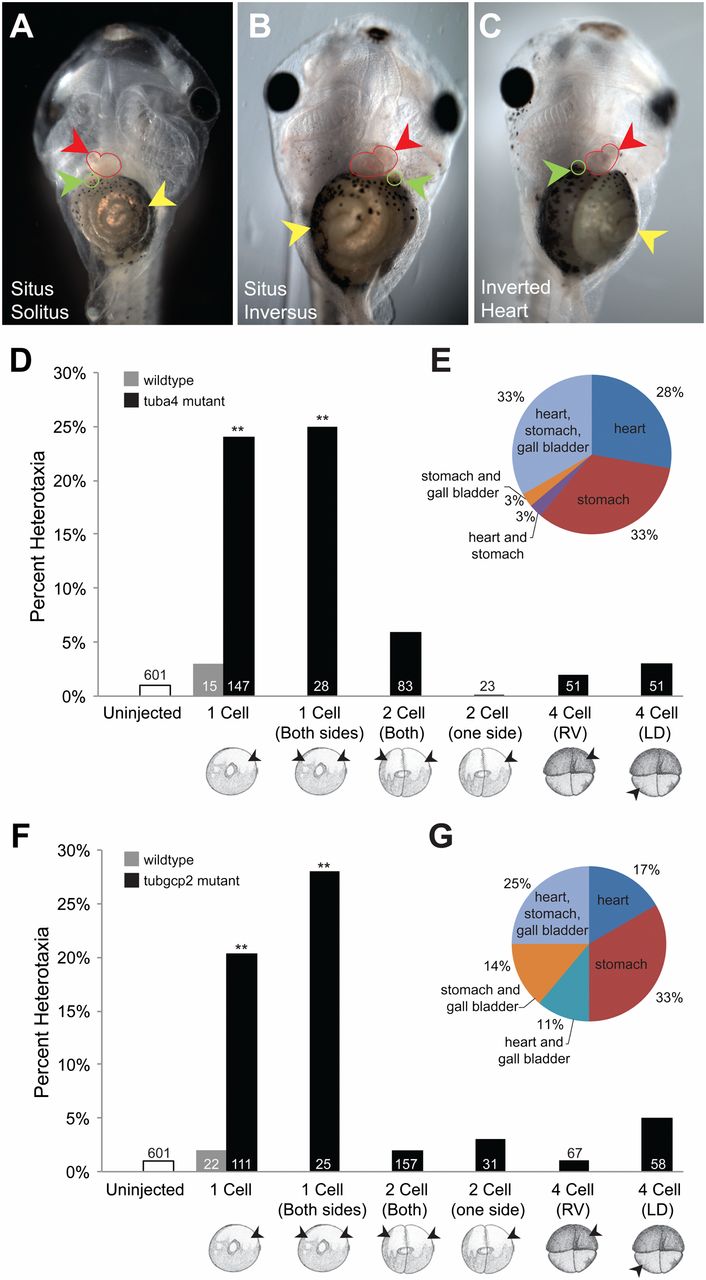 Fig. 1. Tubulin mutations affect LR asymmetry before the first cleavage event. (AâC) Organ situs of stage 45 embryos scored by observation. (A) A wild-type embryo, ventral view, showing the normal arrangement of the stomach (yellow arrowhead), heart apex (red arrowhead), and gall bladder (green arrowhead). (B) A heterotaxic embryo (ventral view) showing reversal of all three organs, i.e., situs inversus, induced by misexpression of the tubulin mutant. (C) A heterotaxic embryo (ventral view) showing reversal of the heart. (D) Statistical comparison of heterotaxia levels scored at stage 45 in embryos injected with mutated α-tubulin mRNA at various early cleavage stages. (E) Types of heterotaxia observed from embryos injected with mutated α-tubulin mRNA at the one-cell stage. (F) Statistical comparison of heterotaxia levels in embryos injected with mutated Tubgcp2 mRNA at various early cleavage stages. (G) Types of heterotaxia observed from embryos injected with mutated Tubgcp2 mRNA at the one-cell stage. **P < <0.01, Welchâs t test, sample sizes as noted in Table S2. For both constructs, it is only the presence before two-cell stage that allows these reagents to randomize laterality.