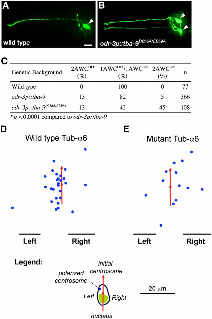 Fig. 5. Mutant tubulin disrupts LR asymmetry in C. elegans embryos and cultured HL-60 cells. (A) Wild-type C. elegans generate one AWCON olfactory neuron cell, which expresses the reporter gene str-2p::GFP, and one AWCOFF cell, which does not (32). (B) C. elegans bearing mutations in aspartic acid (256th) and glutamic acid (259th) residues in α-tubulin exhibit a 2 AWCON phenotype at a frequency significantly higher than that caused by expression of wild-type TBA-9. These frequencies are quantified in C. Differentiated HL-60 cells were transiently cotransfected with GFP-Arrestin-3 (as marker of MTOC) and wild type tub-a6 (D) or mutant tub-a6 (E), and then exposed to uniform fMLP (100 nM), which induced polarization. The red arrow is drawn through the center of the nucleus, pointing to the centrosome, at 0 s as described (35). Final centrosome positions are indicated by the blue dots, relative to all red arrows coaligned. Whereas wild-type tub-a6 does not affect the leftward bias, mutant tub-a6 abolishes it (Ï2 test, P < 0.01). (Scale bar, 20 μm.)