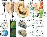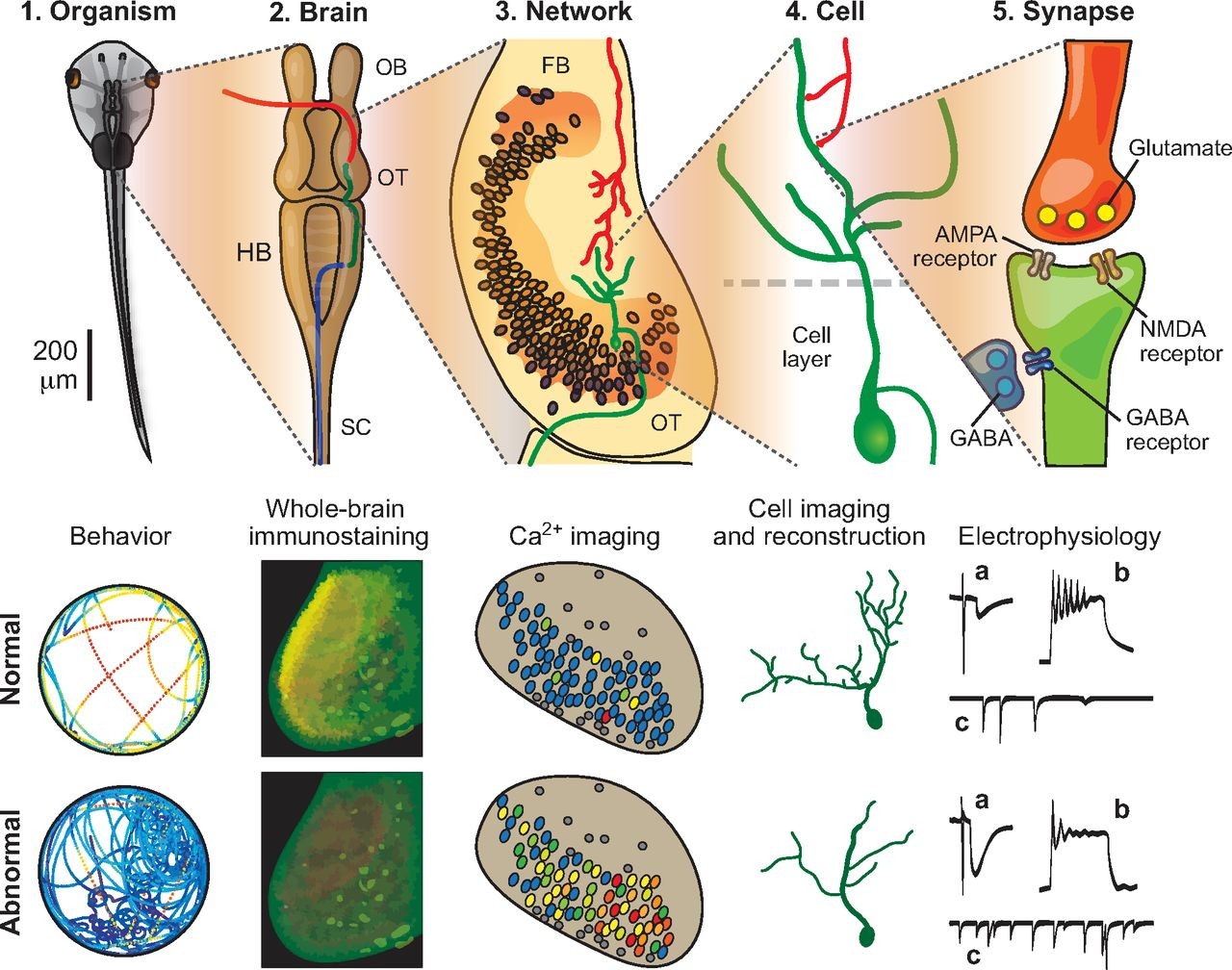 Fig. 1. The Xenopus tadpole as a research model, shown with key experimental techniques that are used to differentiate between normal and abnormal patterns of neural development. (1) Top: view of the animal at ca. 3 weeks post-fertilization. Several behavioral tests can be used to assess brain development: for example, wild-type animals usually swim along the sides of the container (represented by a circle; bottom), whereas animals with altered excitation/inhibition balance tend to circle in the middle of it. (2) Top: general view of the brain. OB, olfactory bulbs; OT, optic tectum; HB, hindbrain: SC, spinal cord; red, projections from the retina; green, tectal projections to the hindbrain; blue, descending projections to the spinal cord. An isolated brain provides an accessible in vitro preparation, and whole-brain immunostaining (bottom) can be used to quantify global alterations in brain biochemistry (an exaggerated staining for GABA is shown). (3) Top: horizontal section of the optic tectum (OT) and caudal forebrain (FB); at this level, Ca2+ imaging can be used to detect abnormal seizure-like patterns of activity (bottom). (4) At the neuron level, in vivo or ex vivo imaging allows assessment of cell morphology development. (5) At the synaptic level, electrophysiology offers a way to quantify maturation of synaptic and intrinsic properties of the cell through recordings of (a) evoked synaptic responses, (b) spiking in response to current injections and (c) spontaneous synaptic activity. The figure is inspired by experimental data published in the following papers: (Aizenman et al., 2002; Bestman et al., 2006; Ruthazer et al., 2006; Pratt and Aizenman, 2007; Hewapathirane et al., 2008; Bollmann and Engert, 2009; Hiramoto and Cline, 2009; Straka, 2010; Bell et al., 2011; Marshak et al., 2012; Miraucourt et al., 2012). |