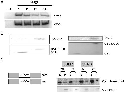 xARH interacts with the LDL and VTG receptors. A, total RNA was isolated from embryos at different stages and xARH expression analyzed by reverse transcriptase-PCR. Ornithine decarboxylase (ODC) served as the loading control. Reaction without reverse transcriptase added (âRT) was used as the negative control. B, GST pull-down assays showing interaction between xARH and the LDL and VTG receptors. In vitro translated and 35S-Met labeled xARH-N terminus (residues 1â212) or VTGR was mixed with purified GST-LDLR or GST-xARH. The GST fusion proteins and bound proteins were pulled down with glutathione-Sepharose beads and analyzed by SDS-PAGE. The GST fusion proteins were visualized by Coomassie Blue staining. The in vitro translated proteins were detected by exposure to a PhosphorImager screen. C, the cytoplasmic tails of the LDLR and VTGR were translated in vitro and labeled by 35S-Met incorporation. In mutants (mt), the NPVY motifs were changed to NPVA. Purified GST-xARH fusion protein from E. coli was mixed with the cytoplasmic tails and glutathione-Sepharose beads. The beads were spun down and boiled in SDS loading buffer (pellet). Both the supernatant (S) and pellet (P) fractions were resolved by SDS-PAGE. The cytoplasmic tails were visualized by exposure to a PhosphorImager screen. The GST-xARH protein was detected by Coomassie Blue staining.