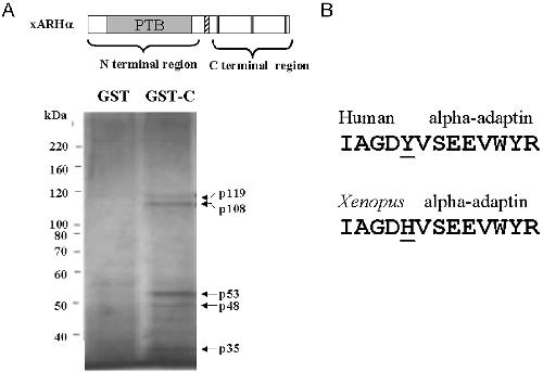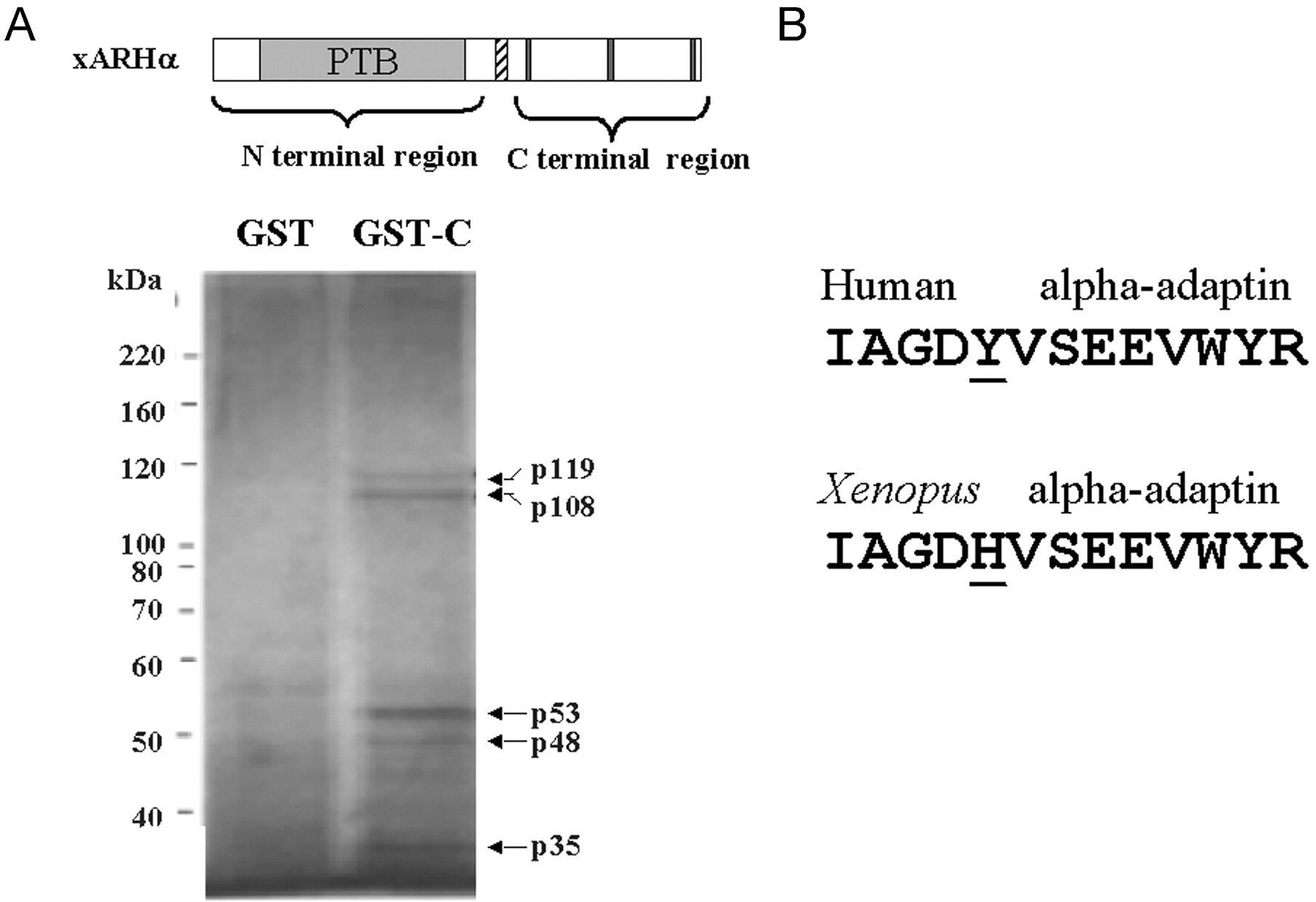 xARH interacts with both α- and β-adaptin. XARH-binding proteins were pulled down with GST-C. Western blot analysis was performed using either monoclonal anti-α or -β adaptin antibody (Affinity BioReagents, Inc. and BD Bioscience). Both α- and β-adaptin (arrowheads) can be pulled down by GST-C but not by GST alone. The lower molecular weight mass are most likely β-adaptin degradation products.