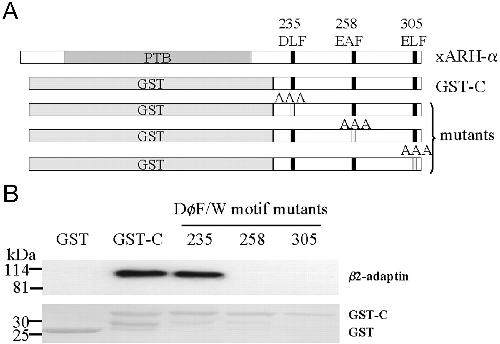 DÏ(F/W) motifs are required for the interaction between xARH and the AP-2 complex. A, diagram of xARH mutants fused to GST used in the analysis of the DÏ(F/W) motifs. The DÏ(F/W) motifs at positions 235, 258, and 305, respectively, were individually mutated to AAA. B, fusion proteins were used in pull-down assays to test for the binding of β2-adaptin to ARH and were analyzed subsequently by Western blotting. The nitrocellulose membrane was stained with Ponceau S to visualize the GST fusion proteins and to confirm equal loading. GST and GST-C served as the negative and positive controls, respectively.