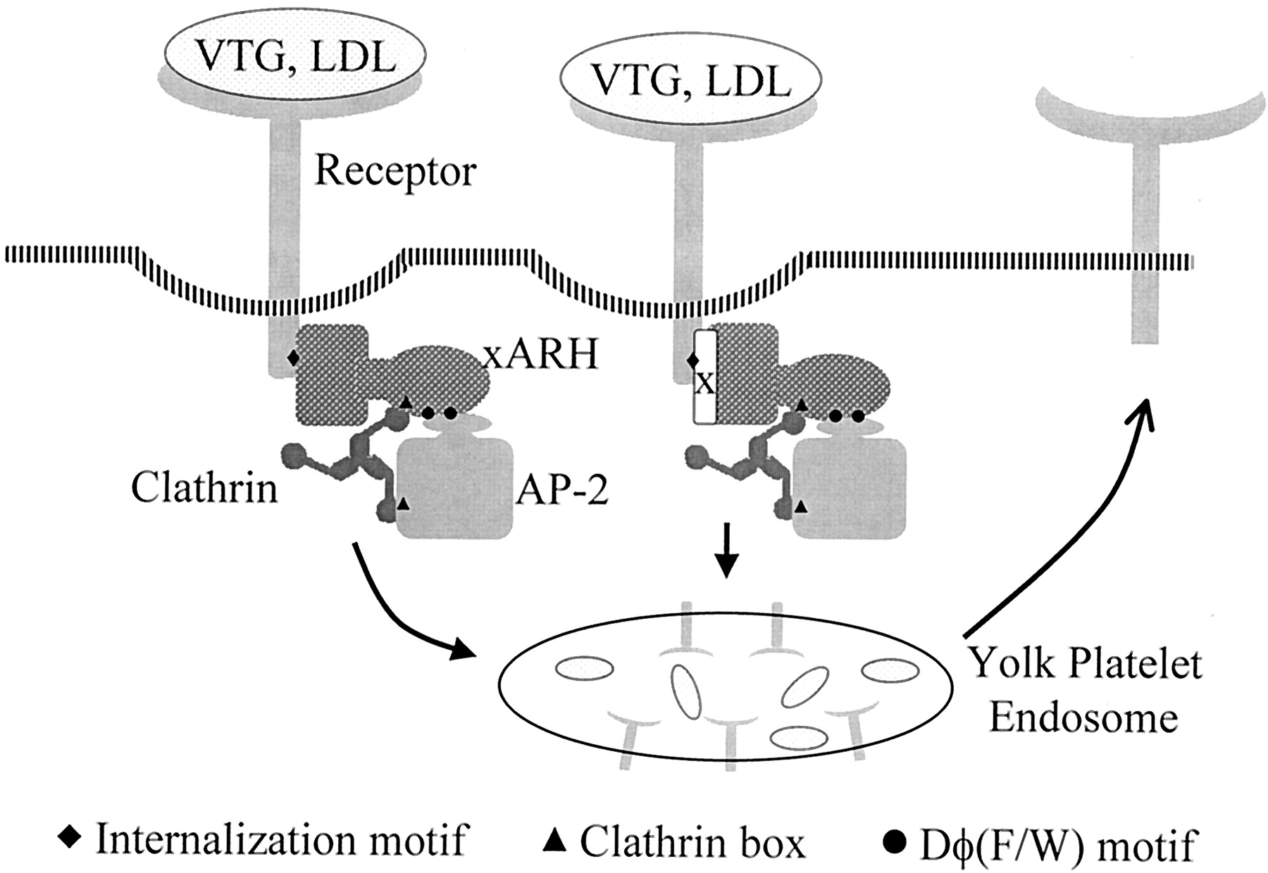 Models favored for xARH function in LDL receptor family mediated endocytosis in oocytes and embryos. Lipoprotein receptor and ligand are internalized through clathrin-mediated endocytosis. The receptor and ligand dissociate in the endosome, and yolk protein is stored there (Yolk Platelet). The receptor is recycled back to the plasma membrane. Later in development, the ligand (vitellogenin, lipoprotein) is degraded and used as a source of nutrients by the embryos (not shown). The xARH-N-terminal PTB domain interacts with the internalization motif of the receptor directly or indirectly through interaction with unknown protein (X). For the LDL receptor, this motif is NPVY and is likely YXXφ for the VTG receptor. The C-terminal region of xARH has multiple motifs to associate with the endocytic machinery, AP-2 complex, and clathrin.