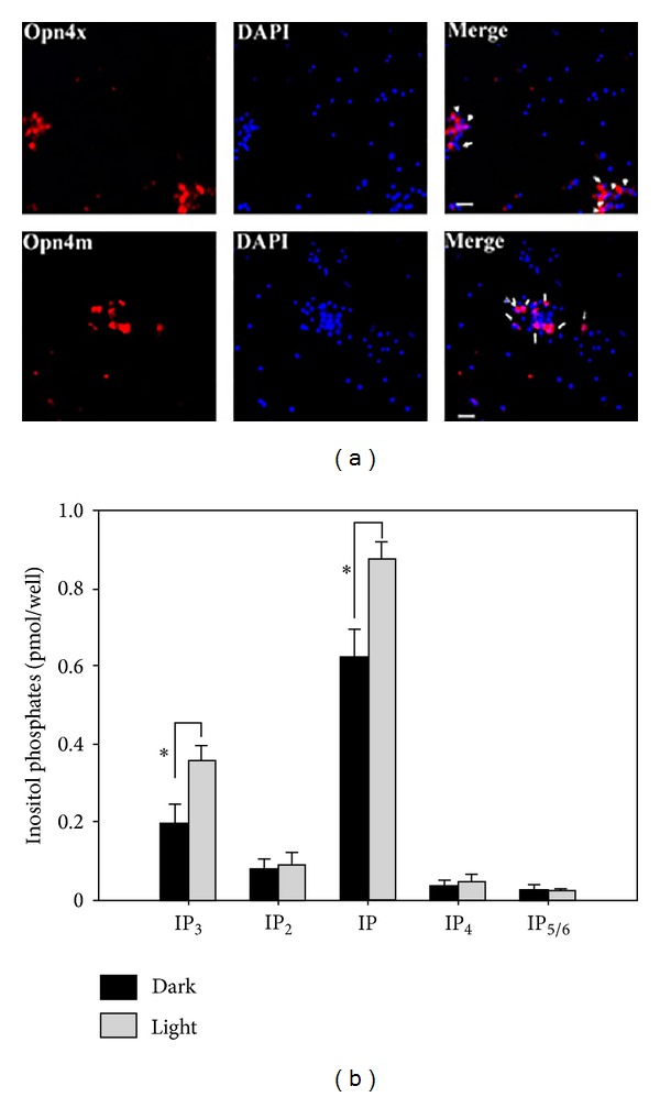 Figure 2. Melanopsin expression and light responses in RGC cultures. (a) Primary cultures of embryonic RGCs maintained for 48–72 h were immunolabeled for Opn4x or Opn4m with specific antibodies and DAPI (nuclei staining). The white arrows identify clusters of Opn4 (+) cells present in RGC cultures observed at 40X. (b) Content of inositol phosphates (IPs) in primary cultures of RGCs maintained in the dark (black squares) or stimulated by light (gray squares). Cultures previously incubated with myo-3H inositol for 48 h were light-stimulated during 90 sec to investigate the generation of different IP derivatives directly in RGCs. IP production was evaluated after bright light stimuli and control cells were maintained in the dark as described in the text. Significant increases in radiolabeled IP3 and IP were seen in cultures exposed to bright white light as compared with dark controls (P < 0.04). On the contrary, no significant light-dark differences were found in the content of other IPs determined such as IP2, IP4, and IP5/6. See text for further details.