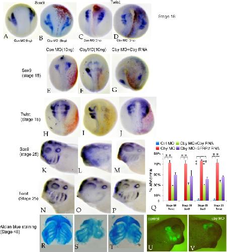 Fig. 4. To examine the effects of morpholino down regulation of Cby, we carried out in situ hybridization of embryos injected in one of two blastomeres. Compared to embryos injected with control MO (A and C), injection of 5 ng/blastomere of Cby MO (B and D) had little apparent effect on Sox9 (A and B) or Twist1 (C and D) expression. In contrast to control MO injected embryos (E and H), the injection of 10 ngs/blastomere Cby MO (F and I) produced a dramatic reduction in both Sox9 (E and F) and Twist1 (H and I). These effects were rescued by the co-injection of Cby-GFP-rescue RNA (200 pg/side) with Cby MO (10 ngs/blastomere)(G â Sox9, J â Twist1). A similar effect was seen in later stage embryos; compared to control embryos (K and N), the injection of 10 ngs/blastomere Cby MO (L and O) led to a reduction in Sox9 (K and L) and Twist1 (N and O) expression. This phenotype could be partially rescued by the co-injection of Cby-GFP-rescue RNA (200 pg/side)(M â Sox9, P â Twist1). The results from10 ngs/blastomere injection experiments are quantified in part Q with p-values (* for p<0.05 and ** for p<0.01). Alcian Blue staining revealed defects in Cby MO (10 ngs/blastomere) injected embryos (S) compared to control (R) embryos; these defects were ameliorated by co-injection of Cby-GFP-rescue RNA (V). Neural crest transplants from GFP injected embryos migrate normally (U) while the analogous region from Cby morphant embryos (5 ngs/embryo) failed to migrate (V). |