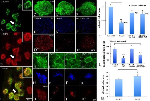 Fig. 5. To characterize the intracellular localization of Cby-GFP, both blastomeres of two-cell stage embryos were injected with Cby-GFP RNA (200 pg/embryo). Ectodermal explants were isolated at stage 9 and fixed at stage 18. Confocal images were taken at 40X magnification. Immunofluorescence staining was performed with an chicken anti-GFP antibody (A) and a rabbit anti-X. laevis Centrin antibody (B), (C) is the merged image of (A) and (B), insets in each panel show higher magnification view. In explants from Cby-GFP RNA injected embryos, we did find juxtaposed ciliated cells (arrows)(see below â part M). At higher injected RNA levels, Cby-GFP can also be seen associated with membranes. To examine the effects of reducing Cby levels on the frequency of ciliated cells (DâG) and the number of basal bodies per ciliated cell (HâL) both blastomeres of two-cell embryos were injected with membrane-GFP RNA together with either control MO (D, Dʹ, Dâ² and H, Hʹ, Hâ²), Cby MO (E, Eʹ, Eâ² and I, Iʹ, Iâ²), Cby MO plus Cby-GFP RNA (F, Fʹ, Fâ² and J, Jʹ,Jâ²), or Cby MO plus SFRP2 RNA (K, Kʹ, Kâ²), Membrane-GFP (DâK) was visualized using an anti-GFP antibody, while anti-AAT (DʹâKʹ) and anti-centrin (Dâ²âKâ²) antibodies were used to visualized ciliated cells and basal bodies, respectively. Confocal images were taken at 10à magnification. Quantitation of the Cby morpholino׳s effect on the number of ciliated cells per cap (G) (y-axis corresponds to number of cilia per area, normalized to control morphant explants) and the number of basal bodies per cell (L) are shown. Injection of Cby-GFP RNA (M) led to an increase in the number of ciliated cell per unit area in ectodermal explants. Comparisons between conditions are marked by horizontal bars (* for p<0.05 and ** for p<0.01). |