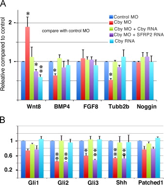 Fig. 8. Each blastomere of a two cell embryo was injected with either Control or Cby morpholino (10 ngs/embryo total) together with RNA encoding membrane-bound GFP. In rescue studies, embryos were also injected with RNAs (200 pgs/embryo total) encoding either Cby-GFP-rescue or SFRP2. Embryos were analyzed at stage 11 by qPCR. Panel A displays the results for Wnt8a, BMP4, FGF8, Tubb2b, and Noggin, panel B displays the results for Gli1, Gli2, Gli3, Shh, and Patched RNAs. This experiment was carried out two independent times with similar results. |