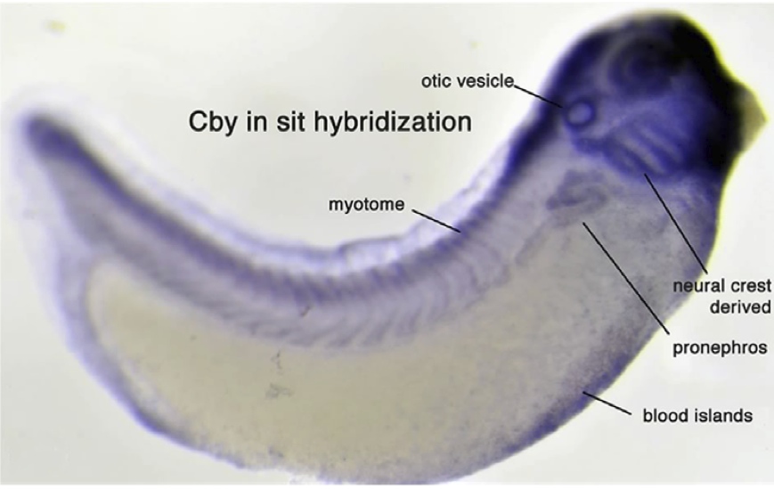 cby1 (chibby homolog 1) gene expression in Xenopus laevis embryo, assayed via in situ hybridization, NF stage 28, lateral view, anterior right, dorsal up.. |