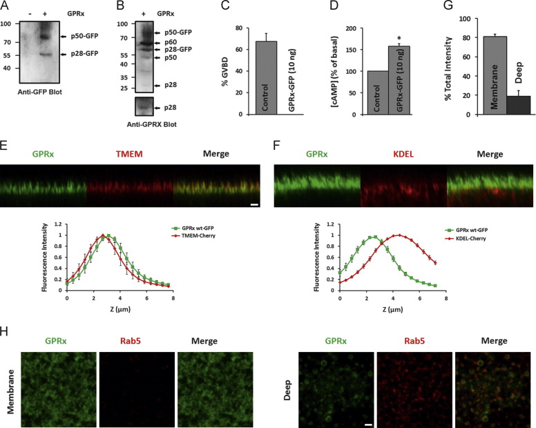 Fig. 1. GPRx is enriched at the cell membrane. (A-B)Xenopus oocytes lysates from 4 uninjected or GPRx mRNA microinjected oocytes were used for western blot analysis using GFP monoclonal antibodies (A) or GPRx antibodies (B). The lower inset in Panel B shows increase exposure for the region around p28 to highlight the faint p28 band. C) Percentage of oocyte maturation as marked by GVBD, following progesterone (P4) treatment in the presence or absence of GPRx-GFP (10 ng/oocyte). Results are from 3 independent donor females. D) cAMP levels in control oocytes and in oocytes microinjected with GPRx mRNA (10 ng/oocyte). Data are expressed as means±SEM and are normalized to uninjected controls (n=3), *p<0.05. (E-F) Oocytes were injected with RNA coding for GPRx-GFP (10 ng/cell) and TMEM-mCherry (20 ng/cell) (11 oocytes from 3 donor females) (E), or KDEL-mCherry (20 ng/cell) (61 oocytes from 8 donor females) (F). Upper panels, representative orthogonal cross section images through a z-stack of confocal images. Scale bar is 2 μm. Lower panels, co-localization analysis, data are shown as means±s.e.m., (G) GPRx-GFP distribution between the membrane and the inside of the oocytes. Oocytes were injected with RNA coding for GPRx-GFP (10 ng/cell) and KDEL-mCherry (20 ng/cell). (H) GPRx-GFP co-localizes with Rab5 to early endosomes. Representative focal plane images from an oocyte injected with RNA coding for GPRx-GFP (10 ng/oocyte) and Rab5-Cherry (20 ng/oocyte).