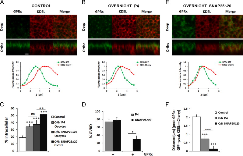 Fig. 2. GPRx-GFP membrane localization is important for its meiotic arrest activity. (A/B/E) Oocytes were injected with RNA coding for GPRx-GFP (10 ng/cell) and KDEL-mCherry (20 ng/cell). Confocal imaging was performed 48 h after injection, on untreated oocytes (A), oocytes treated with P4 overnight (B) or oocytes injected with SNAP25δ20 RNA (20 ng/oocyte) and allowed to express overnight (E). Upper panels, representative images from a deep cytoplasmic focal plane and orthogonal sections are shown. The scale bar is 2 μm. Lower panels, representative fluorescent intensity profile for GPRx-GFP and KDEL-Cherry across a z-stack of images. C) The effect of overnight progesterone (P4) or SNAP25δ20 expression on GPRx-GFP distribution. The histogram shows the percentage of intracellular GPRx-GFP in untreated control cells (Control, 61 oocytes from 8 donor females); cells exposed to P4 overnight (O/N P4, 13 oocytes from 3 donor females) or cells injected with SNAP25δ20 RNA and allowed to express overnight (O/N SNAP25δ20, 31 oocytes from 3 donor females and 12 GVBD from 2 donor females). D) Percentage of oocytes reaching the GVBD stage following progesterone treatment or overnight SNAP25δ20 expression (20 ng RNA/oocyte) in control cells and cells expressing GPRx-GFP (10 ng RNA/oocyte). F) The distance (μm) between the GPRx-GFP fluorescence peak and KDEL-mCherry peak is shown before (24 oocytes from 8 donor females), after overnight P4 (13 oocytes from 3 donor females), and after expression of SNAP25δ20 (12 cells from 2 donor females). All data are shown as means±s.e.m., âp<0.05, ââp<0.001, âââp<0.0001 when compared to control or as indicated by the bar.