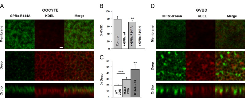 Fig. 4. Function and distribution of an inactive GPRx mutant, GPRx-R144A. A and D) Oocytes were injected with GPRx-R144A-GFP (10 ng RNA/cell) and KDEL-mCherry (20 ng RNA/cell) and imaged 48 h later. Representative images from the membrane plane, deep cytoplasmic focal plane and orthogonal sections through the entire z-stack of images are shown for an untreated oocyte (A) and a P4-treated oocyte that has matured past the GVBD stage (D). The scale bar is 2 μm. B) Rates of oocyte maturation in response to an overnight P4 incubation in control untreated oocytes (50 oocytes); and oocytes injected with RNA coding for GPRx-wt (60 oocytes), GPRx-R144A (67 oocytes) or GPRx-R144H (60 oocytes) (10 ng RNA/oocyte). Data are from 4 donor females. C) Percentage of intracellular GPRx-GFP (WT; 61 cells), GPRx-R144A-GFP before (R144A CON; 15 oocytes) and after P4treatment resulting in oocyte maturation (R144A+P4; 11 cells). All data are shown as means±s.e.m., âp<0.05, ââp<0.001, âââp<0.0001, ns, not significant, when compared to control or as indicated by the bar.