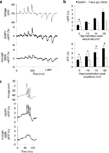 Figure 3. Monitoring simulated hyperpolarizations and subthreshold potentials in voltage-clamped neurons. (a) ASAP1 can detect subthreshold potential and hyperpolarization waveforms in cultured hippocampal neurons. Subthreshold depolarizations and hyperpolarizations have peak amplitudes of 5, 10, 15, and 20 mV, and peak full width at half maximum of 17 ms (depolarizations) and 38 ms (hyperpolarizations). (b) Quantification of the fluorescence responses to subthreshold depolarizations (top) and hyperpolarizations (bottom). Asterisks identify statistically significant differences from pairwise two-tailed t-tests adjusted for multiple comparisons using the Holm-Bonferroni method (p = 0.006, −5 mV waveform; p = 0.0005, 0.008, 0.007 and 0.003 for the −5, −10, −15 and −20mV waveforms, respectively). Multiple comparisons adjustments were performed separately for depolarizations and hyperpolarizations. n = 6 (ASAP1) and 4 (ArcLight Q239) neurons from the same litter. Error bars, SEM. (c) ASAP1’s faster kinetics allow improved resolution of a 100-Hz, three-AP waveform sequence in cultured hippocampal neurons (ASAP1, n = 8 neurons; ArcLight Q239, n = 6 neurons; all cells from same litter). Command voltage spike FWHM is 1.8 ms. Additional examples are in Supplementary Fig. 7.