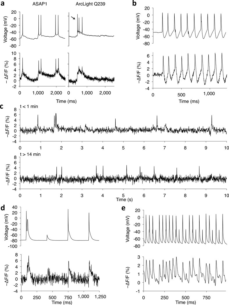 Figure 4. Imaging neural activity in current-clamp from cortical slices and dissociated hippocampal cultures. (a) Fluorescence responses of ASAP1 (left) and ArcLight Q239 (right) to spontaneous subthreshold potentials and APs in cultured hippocampal neurons. From cell to cell, ASAP1 mean fluorescence responses ranged from −4.8 to −8.1 %, averaging −6.3 ± 0.6 % (n = 6 neurons from 5 litters, ≥ 10 APs per neuron). Arrow, AP not detected by ArcLight Q239. Additional examples are in Supplementary Figure 8. (b) ASAP1 followed a spontaneous AP train in a cultured hippocampal neuron (ΔF/F = −6.2 ± 0.5% mean ± SEM, n = 10 APs). Spontaneous bursts are rare events in cultured neurons and we made this observation only a single time in all our recordings. (c) ASAP1 responses to spontaneous activity in a cultured hippocampal neuron at the beginning (top) and end (bottom) of 15 min of continuous illumination (0.036 mW/mm2). Similar observations were made in 4 neurons from 3 litters; additional examples are shown in Supplementary Fig. 10. (d) In an acute cortical slice from a mouse brain transfected in utero, ASAP1 produced large responses to individual current-induced APs in a Layer-5 pyramidal cell (ΔF/F = −6.2 ± 0.2% mean ± sem, n = 10 spikes; single observation). (e) ASAP1 tracked APs and subthreshold depolarizations in a Layer-2/3 neuron injected with current pulses at 25 Hz. ΔF/F = −1.5 to −3.2 %, across 98 APs total from 4 neurons, each from a different slice from the same animal. All traces are from single trials, without filtering (a,b,d), with LOWESS smoothing (c), or with a 100-Hz 4th-order low-pass Butterworth filter (e).