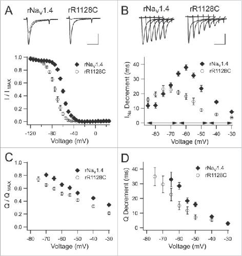Figure 2. Charge movement in wild type rNaV1.4 and rR1128C channels. (A) Traces comparing responses at −60 mV and at 0 mV, from a holding potential of −120 mV. Calibration: vertical 100 nA (−60 mV) or 500 nA (0 mV); horizontal 10 ms. (B) Voltage dependence of charge movement (Q/V relation) in response to 20 ms depolarization, from −110 mV to 60 mV. Values represent mean ± SEM from 34 (rNaV1.4) or 18 (rR1128C) experiments.