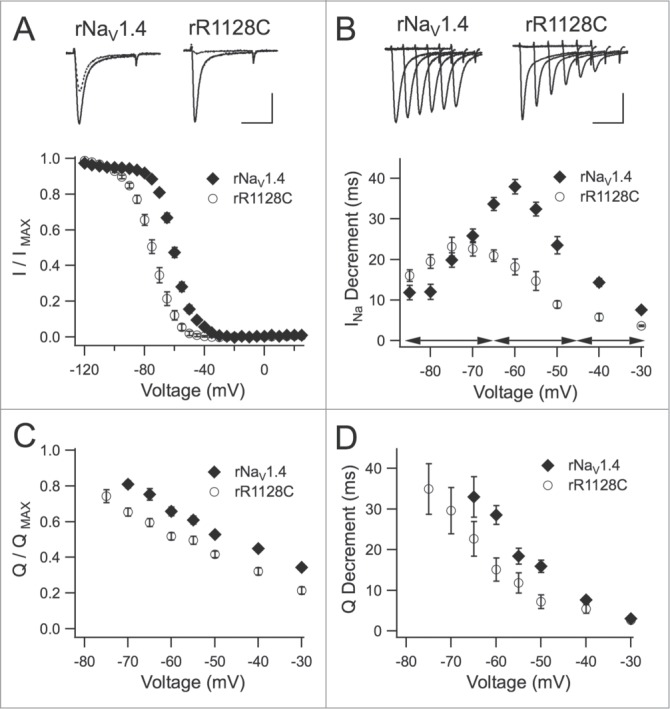 Figure 1. Closed-state fast inactivation in rNaV1.4 and R3C channels. (A) Steady-state availability: channels were conditioned for 300 ms at voltages from −120 mV to 25 mV, prior to test at −20 mV. Traces show test responses following conditioning at −120 mV (solid line) or −60 mV (dotted line), with voltage dependence below. B. Kinetics of sodium current inactivation; channels were conditioned at voltages from −85 mV to −30 mV for variable duration, prior to test at −20 mV. Traces show responses for selected sweeps up to 25 ms conditioning at −60 mV. Plots of voltage dependence are shown below, with arrows representing fast inactivation ranges of recovery, closed-state entry, and open-state entry for wild type rNaV1.4. Calibration for A, B: vertical 2 μA; horizontal 10 ms. (C, D). Charge movement from experiments as in (B) after block of ionic current with 2 μM TTX. Normalized charge (Q/QMAX) after 300 ms conditioning is shown in (C), with kinetics of charge decrement shown in (D). Values represent mean ± SEM from 10 to 29 (rNaV1.4) or 11 to 32 (rR1128C) experiments.