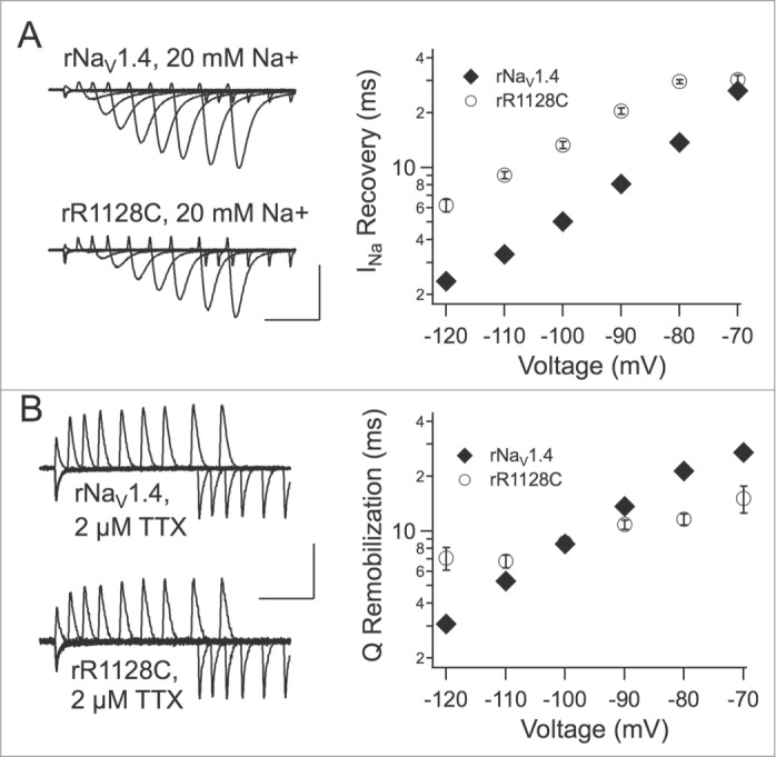 Figure 3. Recovery and charge remobilization in wild type rNaV1.4 and R3C channels, following closed-state fast inactivation with depolarization to −40 mV. (A) Traces of recovery of ionic current with −90 mV hyperpolarizing commands and test at −20 mV, with voltage-dependence shown at right. (B) Traces and voltage dependence of the slow component of charge remobilization in experiments after TTX block, using 0 mV test. Calibration for traces: vertical 1–2 μA (A), 400 nA (B); horizontal 10 ms. Values represent mean ± SEM from 16 to 21 (rNaV1.4) or 8 to 10 (rR1128C) experiments.
