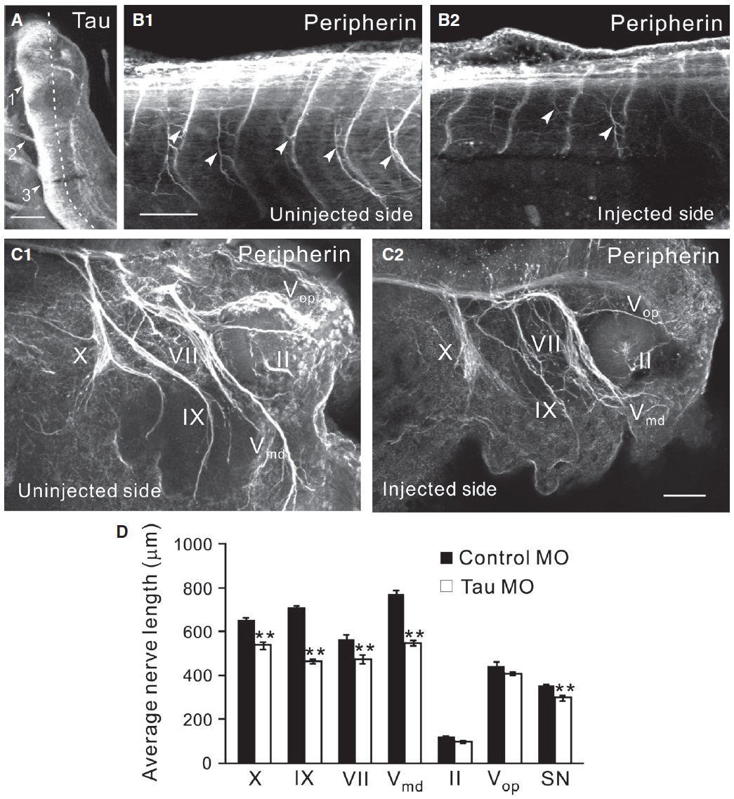 lengths ( SEM) of cranial and spinal peripheral nerves of tau and control MO-injected animals immunostained for peripherin at st. 37/38 (N = 3). **Significantly