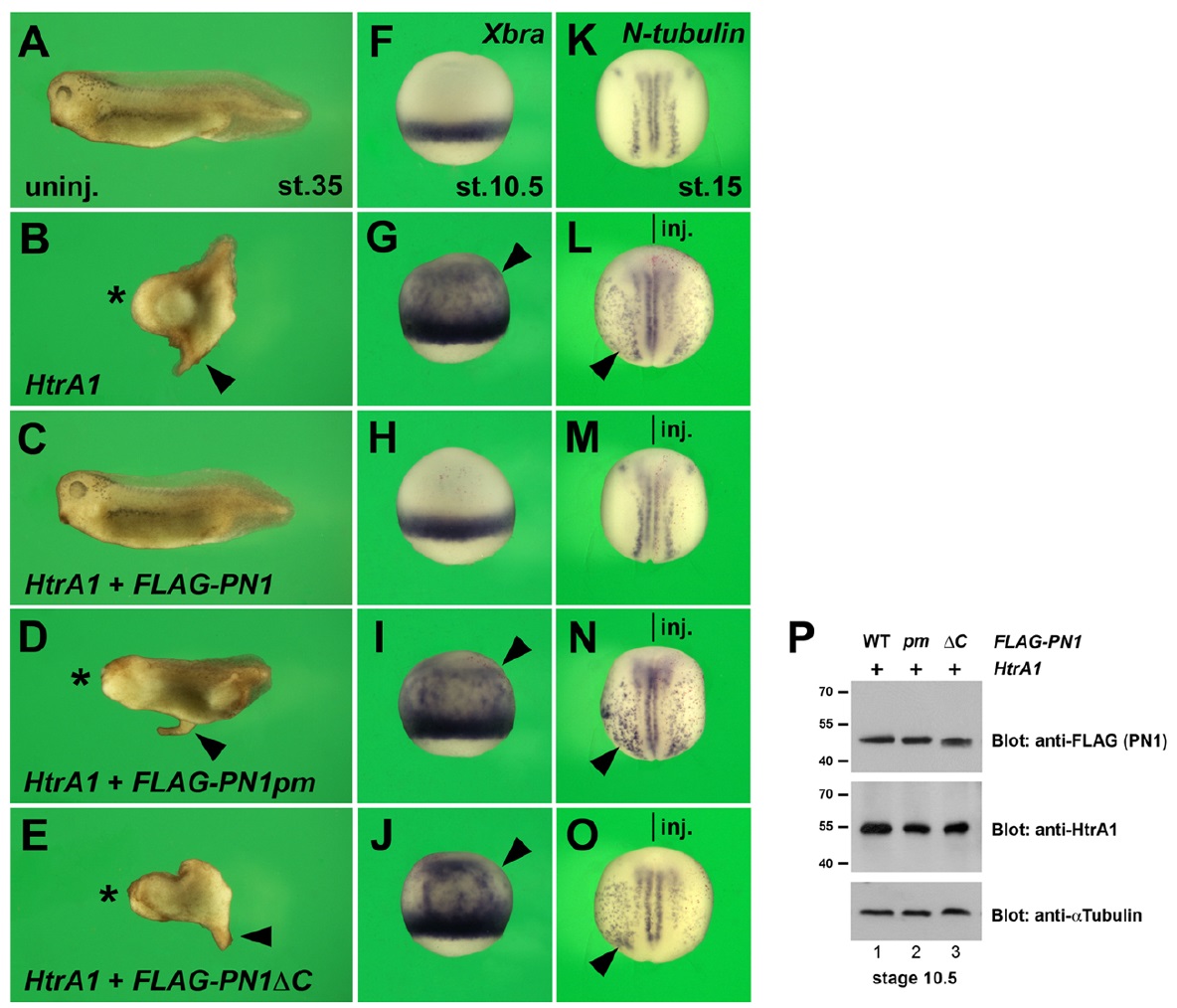 Fig. S4. PN1 inhibits via its RCL HtrA1-induced posteriorization, mesoderm induction, and neuronal differentiation (A-E) HtrA1 mRNA induces lack of head structures (asterisks) and secondary tail formation (arrowhead) at stage 35. Co-injection of FLAG-PN1 mRNA restores normal head development and blocks ectopic tail outgrowth induced by HtrA1 mRNA. FLAG-PN1pm has weak and FLAG-PN1pm mRNA no rescuing effect. (F-O) HtrA1 induces ectopic Xbra expression in the animal hemisphere (arrowhead in M) and ectopic N-tubulin expression in the lateral epidermis (arrowhead in R). FLAG-PN1, but not FLAG-PN1pm or FLAG-PN1DC, restore normal gene expression in HtrA1-injected embryos. (P) Immunoblot analysis of embryos at stage 10.5 after co-injection of HtrA1 and FLAG-PN1, FLAG-PN1pm or FLAG-PN1DC mRNA. α-Tubulin serves as a loading control. Note that FLAG-PN1, FLAG-PN1pm and FLAG-PN1δC proteins were expressed at equivalent levels, and that co-injected HtrA1 mRNA produced comparable protein amounts in each sample. Xenopus embryos were injected into a single blastomere with 100 pg HtrA1- and 300 pg PN1- derived mRNAs. Indicated phenotypes were: B, 21/22; C, 20/26; D, 16/26; E, 28/35; G, 53/53; H, 31/43; I, 26/46; J, 53/53; L, 55/55; M, 42/44; N, 35/41; O, 39/39. |