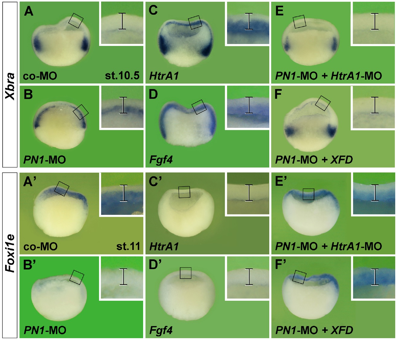 Figure S8. Knockdown of PN1 promotes mesoderm and suppresses ectoderm formation in an HtrA1- and FGF-dependent manner Embryos were separately injected with MOs and mRNAs into the animal pole at the 4-cell stage. Hemisectioned early gastrula embryos are shown after whole-mount in situ hybridization for Xbra (A-F) and Foxi1e (Aâ-Fâ). (A-Bâ) PN1-MO, but not control-MO, induces ectopic Xbra and reduction of Foxi1e expression in deep cells of the animal hemisphere (brackets in insets depict animal cap). (C-Dâ) Injections of 200 pg HtrA1 and 2 pg Fgf4 mRNA induce ectopic Xbra at the expense of Foxi1e expression in the inner layer of the animal cap (insets). (E-Fâ) Injections of HtrA1-MO and 80 pg XFD mRNA restore normal expression of Xbra and Foxi1e in PN1-morphant embryos. Total injected MO amount was 60 ng (+20 ng HtrA1-MO). The frequency of the indicated phenotypes was A, 136/144; Aâ, 50/59; B, 148/177; Bâ, 50/69; C, 21/21; Câ, 47/57; D, 79/79; Dâ, 93/97; E, 66/90; Eâ, 52/56; F, 72/83; Fâ, 45/51. |