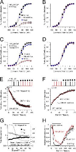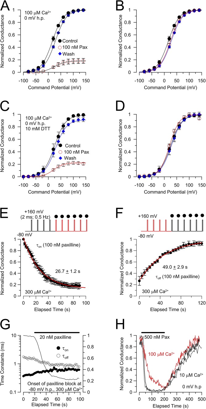 Figure 1. Channels that activate in the presence of paxilline gate with normal voltage dependence and kinetics. (A) G-V curves were normalized to the maximal conductance observed in control saline. Currents were activated with 10 µM cytosolic Ca2+ from a holding potential of 0 mV. For prepaxilline, Vh = 16.31 ± 0.15 mV (z = 0.87 ± 0.01 e); in 100 nM paxilline, Vh = 24.75 ± 0.13 mV (z = 0.86 ± 0.01 e); and, after washout of paxilline, Vh = 28.0 ± 0.19 mV (z = 0.88 ± 0.01 e). (B) G-V curves from A were normalized to the fitted maximum for each condition to highlight the lack of G-V shift. (C) G-V curves were generated in the presence and absence of paxilline, but with all solutions containing 10 mM DTT (n = 7 patches). For control saline, Vh = 25.04 ± 1.2 mV (z = 0.86 ± 0.06 e); with 50 nM paxilline, Vh = 21.21 ± 1.85 (z = 0.79 ± 0.07 e); and after wash, Vh = 28.65 ± 9.0 (z =1.13 ± 0.05 e). (D) The same G-V curves in C are normalized to the maximal conductance in each case to highlight their similarity. (E) 2-ms steps to 160 mV were applied at 0.2 Hz to monitor BK activation with 300 µM Ca2+, while holding the patch at −80 mV. The application of 100 nM paxilline results in slow diminution of BK current with a time constant (fitted red line) of 9.6 ± 1.1 s. (F) For the same patches as in E, steps to 160 mV with 300 µM Ca2+ were used to monitor recovery from paxilline inhibition, with recovery at 300 µM Ca2+ at −80 mV with the indicated recovery time constant (red line). (G) For a single patch, BK current activation (closed circles) was monitored at 160 mV and deactivation (open circles) at −80 mV with 300 µM Ca2+ before and during the application of 20 nM paxilline, showing that paxilline does not alter the kinetics of channels that open and close in the presence of paxilline. (H) A patch was held at 0 mV and 500 nM paxilline was applied at either of two different Ca2+ concentrations (10 or 100 µM). The onset of paxilline block is more rapid with 10 µM Ca2+. |