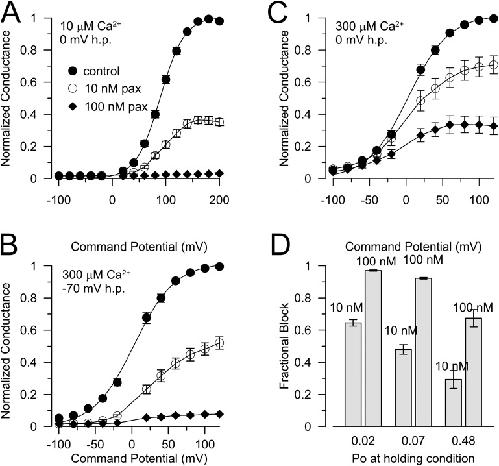 Figure 2. Block by paxilline exhibits an inverse dependence on Po, but no dependence on Ca2+ per se. G-V curves were generated under three equilibration conditions (A: 10 µM Ca2+, 0 mV; B: 300 µM Ca2+, 0 mV; C: 300 µM, â70 mV), with either control saline or either of two paxilline concentrations, 10 or 100 nM. For all patches included in this dataset, each patch was examined under all conditions. Paxilline was applied for 4 min before generation of G-V curves. Among different patches, the sequence of holding conditions was varied. G-V curves were normalized to the maximal conductance observed in the absence of paxilline under each holding condition. Curves to control points are fitted single Boltzmann functions, whereas curves in the presence of paxilline have no significance. (D) The fractional block for voltages from 40 to 120 mV was determined for each paxilline application under the three conditions and plotted in relation to the Po at the holding condition defined by the fitted Boltzmann. For 10 µM Ca2+ and 0 mV, the effective Po was 0.02; for 300 µM and â70 mV, the Po was 0.07; and for 300 µM Ca2+ and 0 mV, the Po at the holding condition was 0.48. |